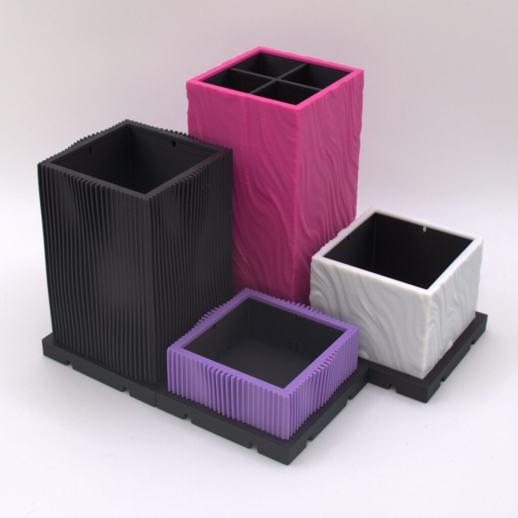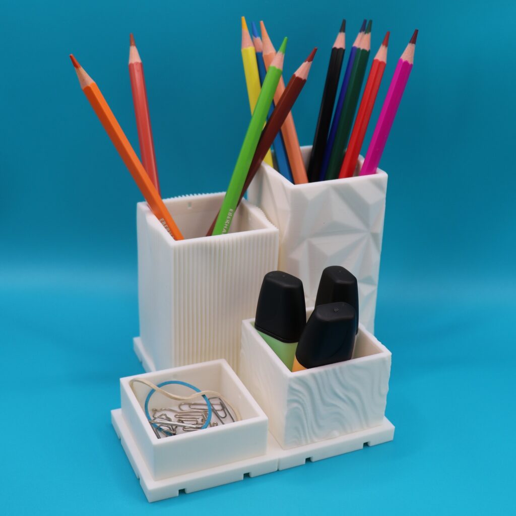 Zum Start halten wir die Stifte-Organizer für euch bereit, bald darauf folgen ein Notizblock-Halter sowie ein Visitenkarten-Halter. Wir haben aber noch sooo viele Ideen für weitere praktische und spannende Module sowie coole Designs, die auf unsere Umsetzung warten.